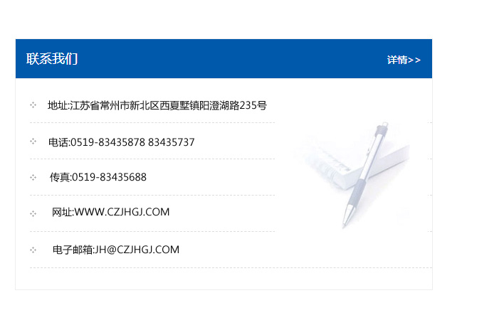 地址:常州市新北區友邦商務大廈1幢16、17層  電話:0519-85101652  傳真:0519-85112595  郵編:213022  網址:www.cz-jiayue_cn.gpbetc.com  郵箱:xiajifengaa@163.com